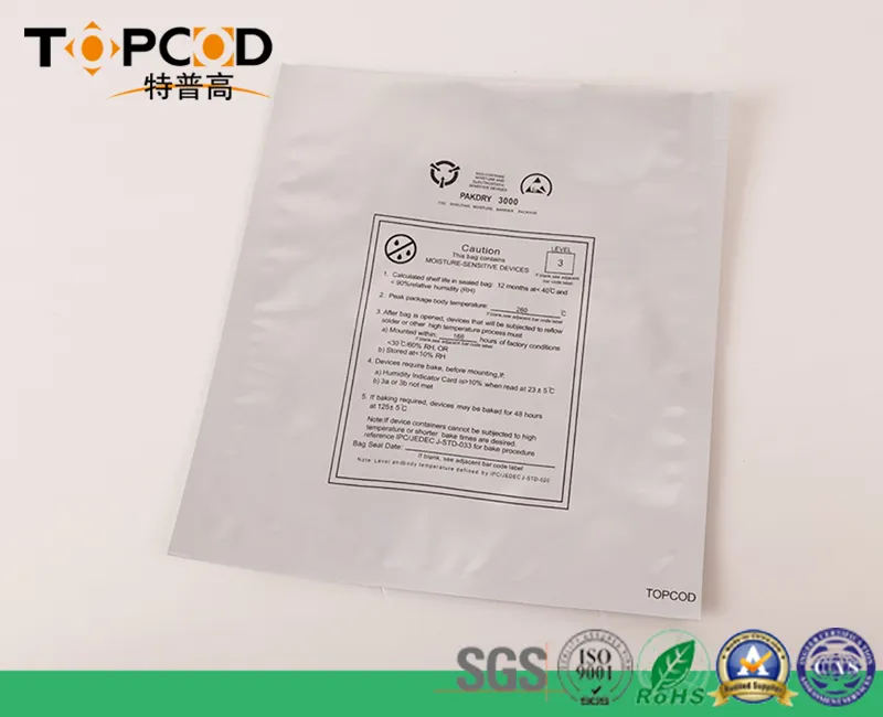 Moisture-proof vacuum bag, also known as Aluminum foil bag, Aluminum-plastic composite vacuum bag, vacuum bag, moisture-proof bag, using imported high quality raw materials formed a production by automatic assembly line, the bag with a standard of moisture-proof logo, has six functions of anti-static, resistance of the electromagnetic interference and moisture proof, high barrier, with good puncture ability of water proof and oxygen proof. The bag should passed the GB & ASTM test and satisfied the strictest environmental protection standard of packing materials in EU and North America. It suitable for the electronics packing that has the requirement of moisture proof. Surface resistance is 108-1010Ω, static release time is less than 0.05 seconds.